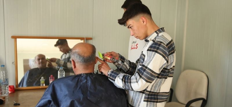 Osmaniye Halk Eğitimi Merkezince Fakıuşağı Mahallesi'ndeki eğitim yerleşkesine konulan konteynerde, usta öğretici ve öğrenciler ile gönüllü kuaförler, depremzedeleri tıraş edip saç bakımlarını yapıyor.