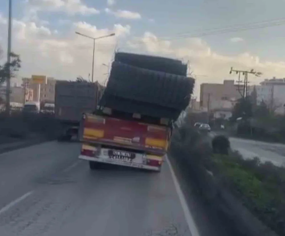 Hatay’ın Payas ilçesinde demir yüküyle trafikte ilerleyen tır tehlike saçtı.