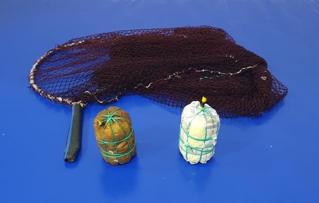 Güvenlik güçleri, şüphelinin üzerindeki iki dinamit ile balık toplamak için kullanılan fileye el koydu.
