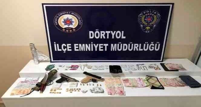 Hatay Emniyet Müdürlüğü ekipleri, uyuşturucu madde imal ve ticaretine yönelik İ.A. ve H.A. isimli şahısların yaşadığı Çaylı Mahallesinde bulunan ikametlerine operasyon düzenledi. Yapılan aramada; 2 adet ruhsatsız tabanca, 7 adet fişek, 1 adet hassas terazi, 2 adet payp, 1.8 gram eroin, 0.7 gram esrar, 2.1 gram metamfetamin, 73 adet uyuşturucu hap ile uyuşturucu ticaretinden elde edildiği değerlendirilen 8 bin 215 lira nakit para, 15 adet çeyrek ve 8 adet yarım altın ele geçirildi.