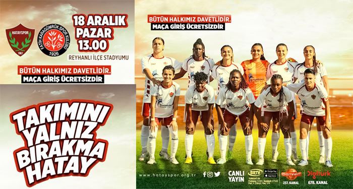 TFF. Türkcell ligi Hatayspor Kadın Futbol Takımı 9.hafta karşılaşmasında 18 Aralık 2022 Pazar günü saat 13:00’te Reyhanlı şehir stadında İstanbul Takımı Wulfz Fatih Karagümrük’ü ağırlayacak.