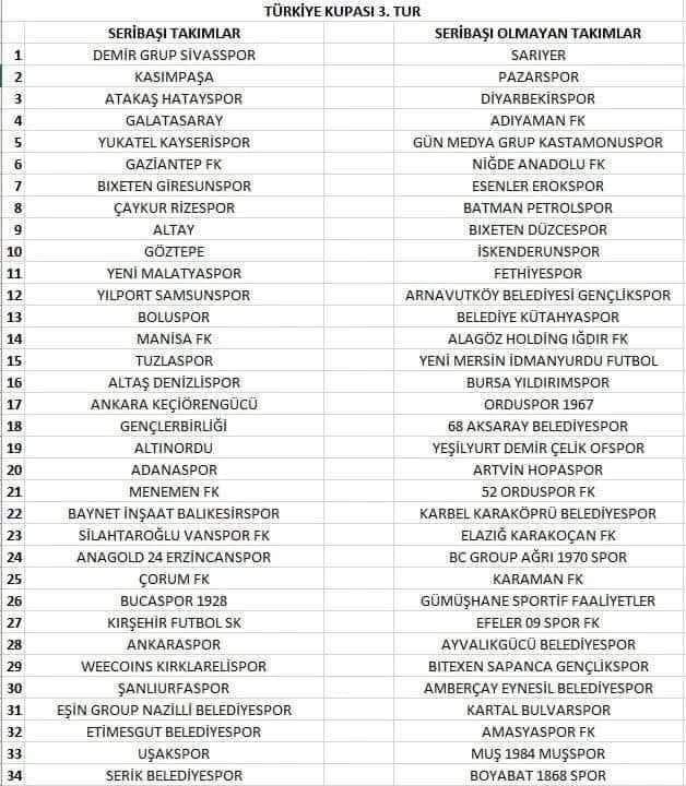 HATAYSPOR VE İSKENDERUNSPOR'UN KUPA SERÜVENİ BAŞLIYOR Ziraat Türkiye Kupası'nda 3. turda mücadele edecek takımlar belli oldu. Atakaş Hatayspor ve İskenderunspor'un rakipleri 4 Ekim Salı günü belli olacak. Ziraat Türkiye Kupası'nda 3. Tur heyecanı başlıyor. 68 takımın mücadele edeceği 3. Turda Atakaş Hatayspor seri başı, İskenderunspor ise seri başı olmayan takımlar arasında yer aldı. 4 Ekim Salı günü saat 14:00'te gerçekleştirilecek kurada Hatay temsilcilerinin rakipleri belli olacak. Seri başı takımlar, seri başı olmayan takımlar ile eşleşecek. Kural gereği seri başı olan Atakaş Hatayspor evinde, seri başı olmayan takımlar arasinda yer alan İskenderunspor ise deplasmanda mücadele edecek.